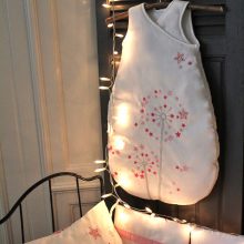 One side with applique embroidered star designs on a white background , the other in a mini flower printed fabric