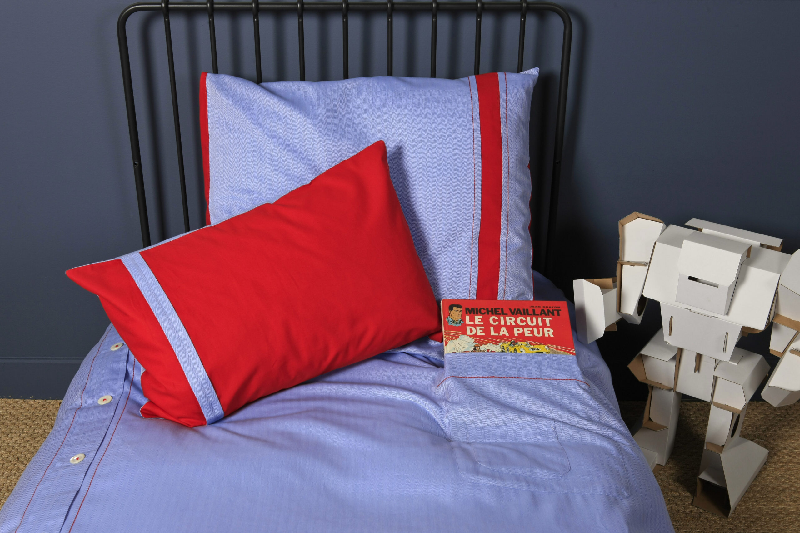 Pillowcase made from organic cotton, in light blue herringbone design with applique red stipe and red stitching on one side, and in red organic cotton with light blue herringbone design on the other side.